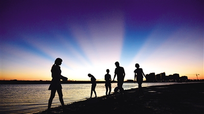 滨海城市海口市,傍晚在海边纳凉和看落日是市民的最爱,尤其是出现七彩云、火烧云等景象时,到海边游玩拍照的人就更多了。千变万化的晚霞,缓缓落入水面的红日令人流连忘返。图为夕阳下的白沙门海滩。南国都市报记者 陈卫东 摄