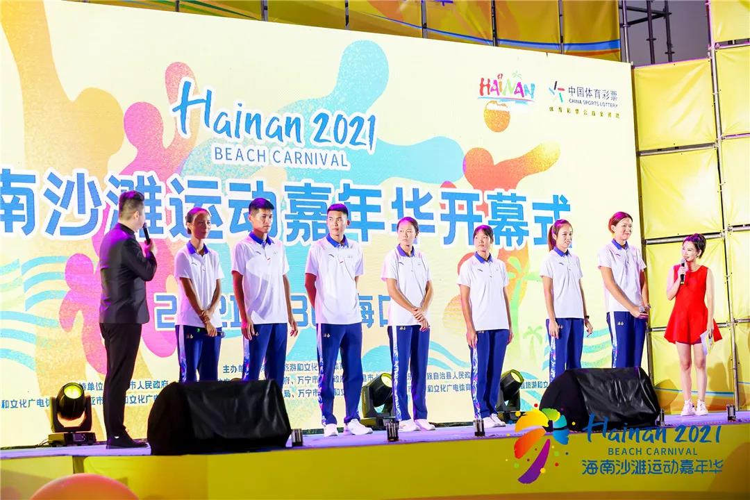2021海南沙滩运动嘉年华开幕式在欢快的歌舞《welcome to 海南》中拉开序幕。开幕式上,海南六个市县代表亮相并授牌。省旅文厅副厅长徐翔鸿宣布2021海南沙滩运动嘉年华正式开幕。