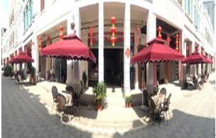 骑楼老街咖啡吧装修风格简约淡雅,精致的咖啡机、琳琅满目的蛋糕柜、香浓的咖啡,外场咖啡桌搭配太阳伞,环绕若干郁郁葱葱的盆栽,整个环境氛围简单、休闲,富有情调。