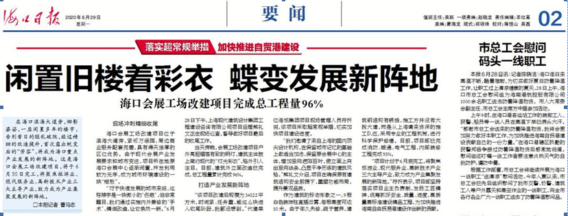 海口会展工场改建项目位于滨海大道旁,紧邻万绿园,周边商业服务配套完善,具有得天独厚的区位优势。由于现代会展产业发展要求和城市变迁,项目所在地原海口会展中心逐渐闲置,开发利用较为无序,成为城市环境建设的一块“短板”。“对于快速发展的城市来说,这栋楼宇是一块微小的‘伤疤’,但非常醒目,我们通过实施内外兼修的‘手术’,精细改造,让它焕然一新。”6月28日下午,上海现代建筑设计集团工程建设咨询有限公司项目经理熊礼文正在现场巡查,督导做好项目最后的收尾工作。