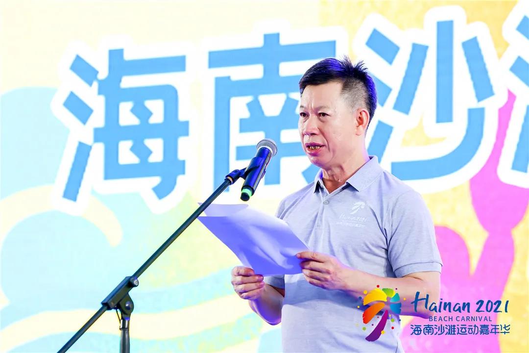 2021海南沙滩运动嘉年华开幕式在欢快的歌舞《welcome to 海南》中拉开序幕。开幕式上,海南六个市县代表亮相并授牌。省旅文厅副厅长徐翔鸿宣布2021海南沙滩运动嘉年华正式开幕。
