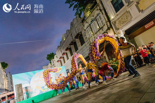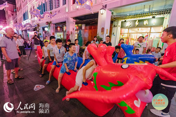进入骑楼老街中山路,所见情景让人眼前一亮。整条街区都经过精心布置,一条条中国龙在上空“腾飞”,一排排装饰精美的文创展位早已准备就绪,各店家正在热情招待市民游客。记者来到“多米手工定制”,见到编织而成的趣味荔枝、粽子以及各种玩偶,做工精美,创意十足,很快吸引了大批游客驻足。此外,现场还有布艺口金包、孔雀羽饰品、沙画艺术手工、民间非遗糖画、古董风手作、本土手工饮品等多种类型产品,手工DIY、抽奖等活动,让市民游客玩得不亦乐乎。