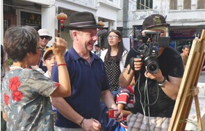 《遇见海南人》摄制组的拍摄第一站是海口中山路。20日下午,拍摄伊恩·莱特在此邂逅炭画世家传人韩翠琼老人,韩老太亲手传授伊恩·莱特中国传统的毛笔字,并现场为他演绎神奇的炭画艺术,伊恩·莱特看完后对韩老太赞不绝口。